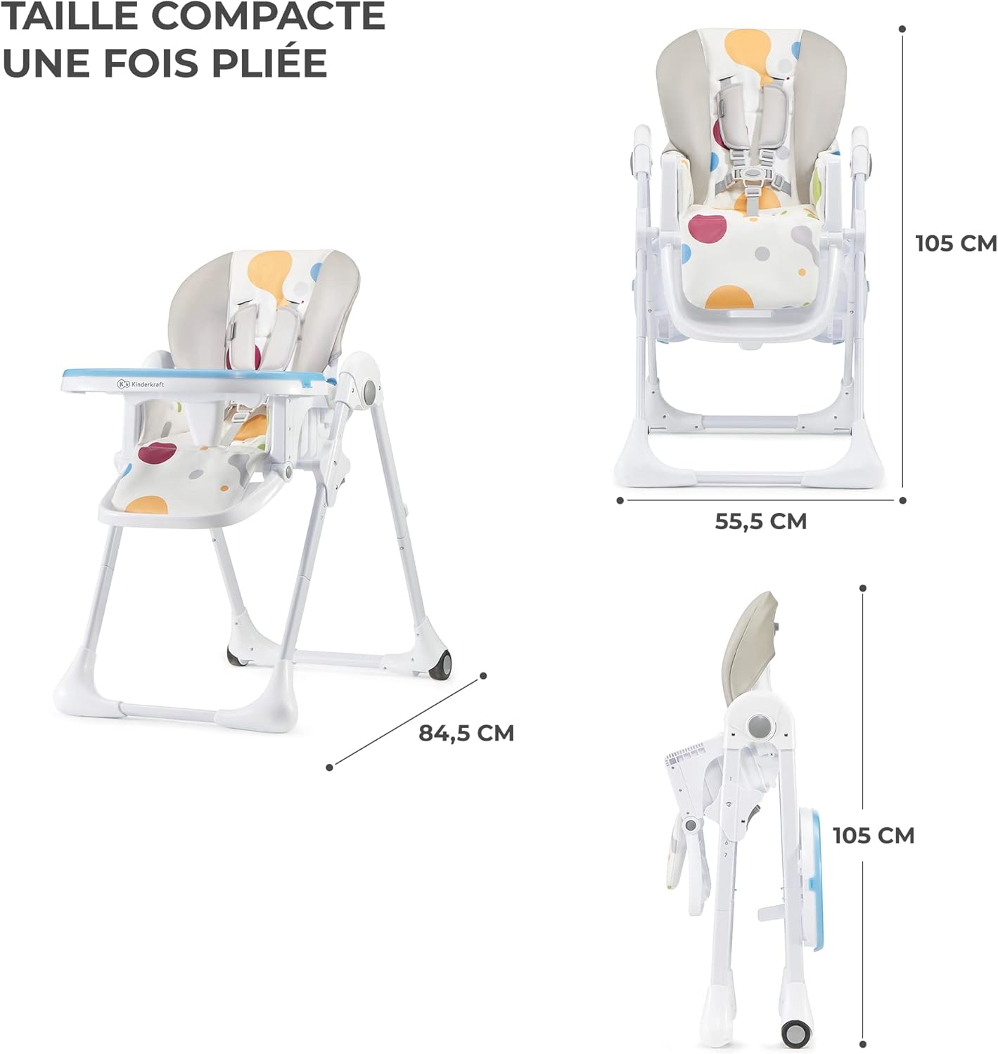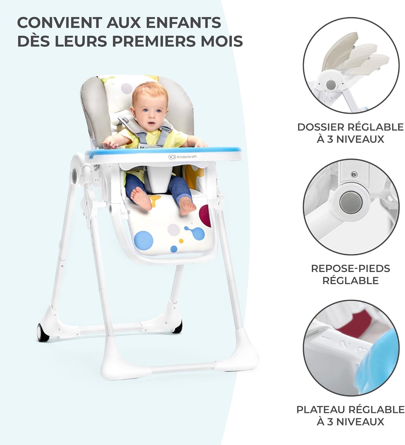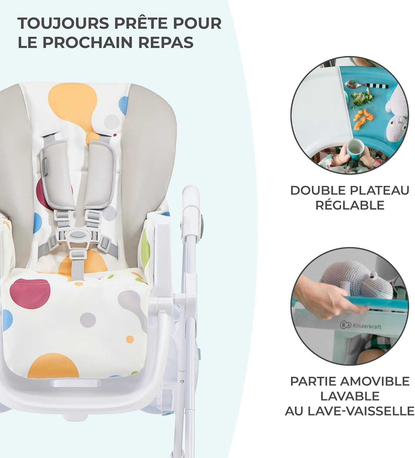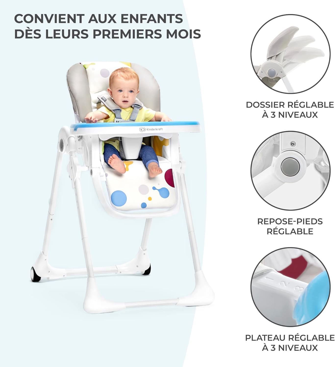 Confort, sécurité et praticité réunis dans une chaise haute pensée pour faciliter les repas dès les 6 mois de votre bébé. Kinderkraft YUMMY est une chaise multifonctionnelle et pliable, idéale pour un usage quotidien et facile à ranger.