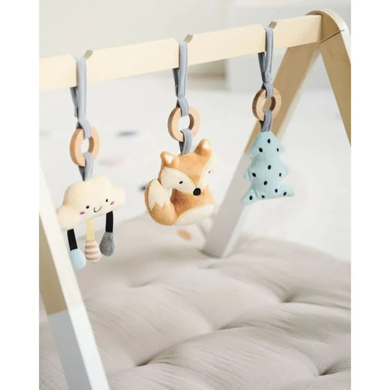 - Stimule les Sens : Les trois jouets inclus – un nuage, un renard et un arbre – sont conçus pour éveiller les sens de votre bébé. Chaque jouet émet un bruit distinctif : le renard avec son grelot, le sapin crépite et le nuage dispose d’un petit klaxon. Ces sons captivants encouragent l’exploration et la découverte.